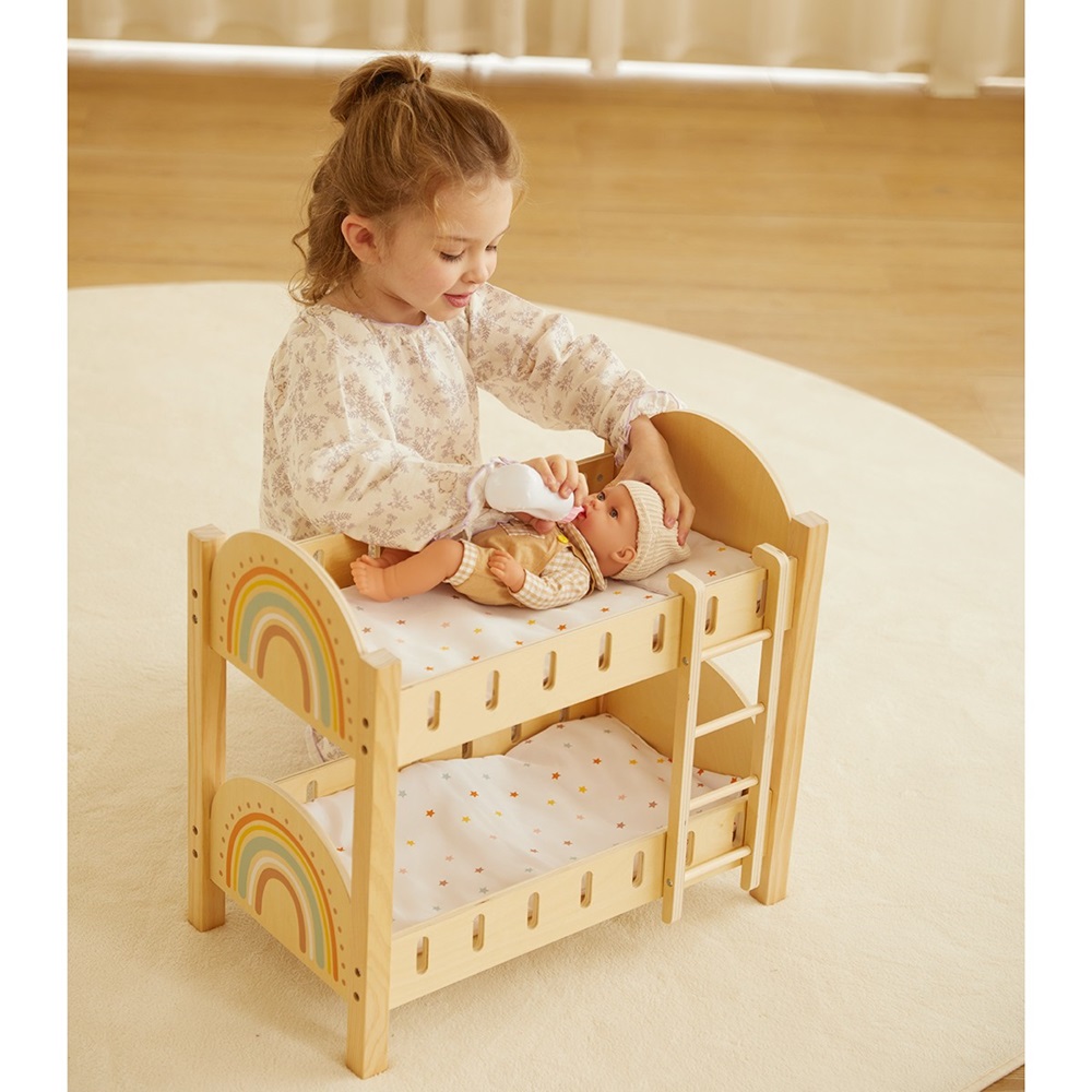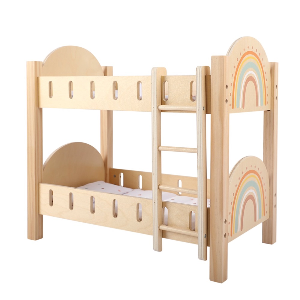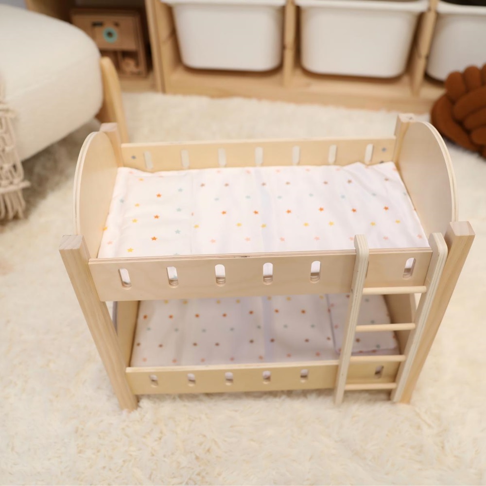 Doll Bunk Bed Fun: Wooden bunk bed with 2 pillows and 2 cushions.