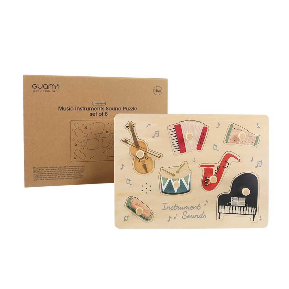 Musical Puzzle Fun: 8-piece wooden instrument set for toddlers.