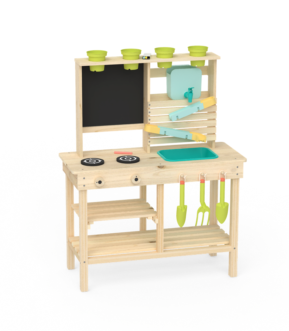Dual Play Zones: A fully equipped pretend kitchen with a sink, two stovetop burners, and a chalkboard for menu planning, plus a gardening station with hooks for tools and a shelf for pots.