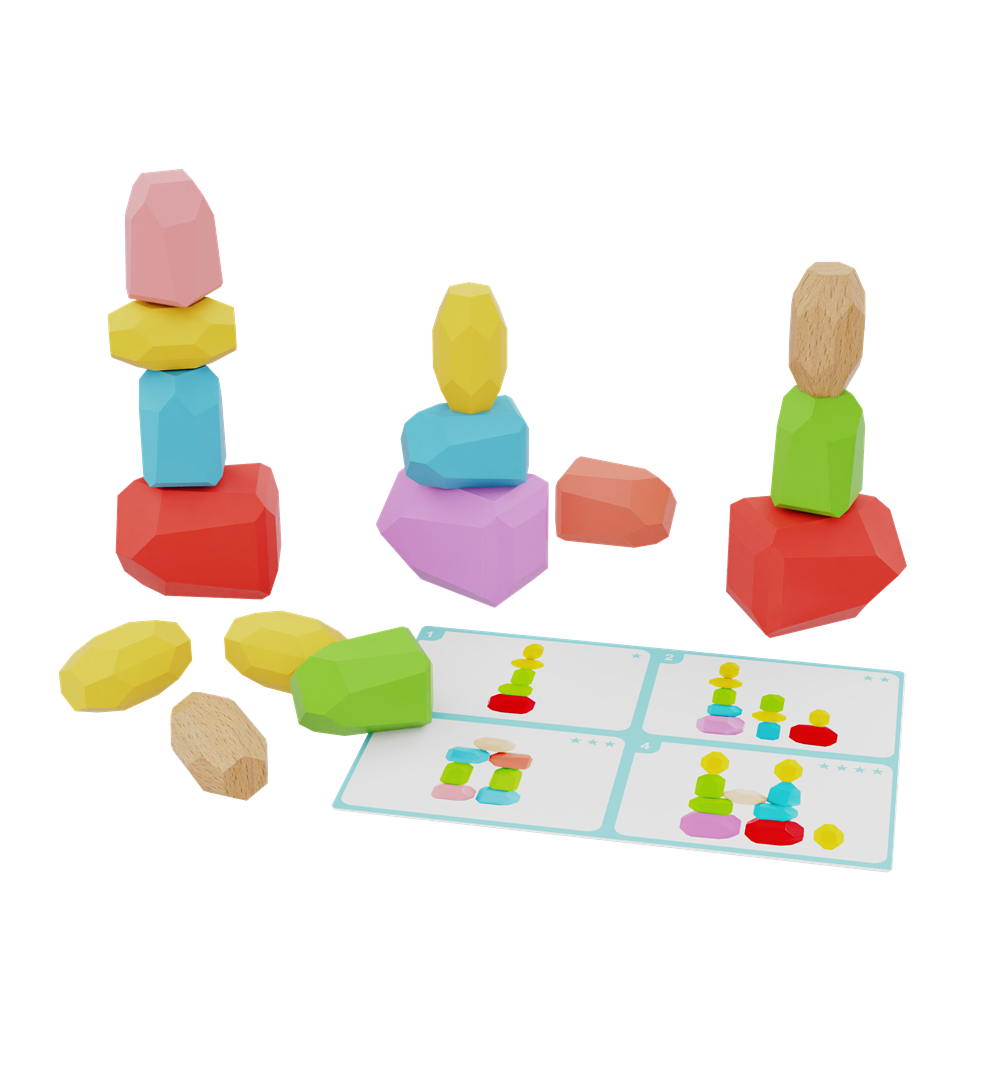 Unique Balancing Stones: Includes a variety of irregular, faceted wooden stones in bright, non-toxic colors and natural wood finishes, each with a distinct shape to encourage creative stacking and balancing.