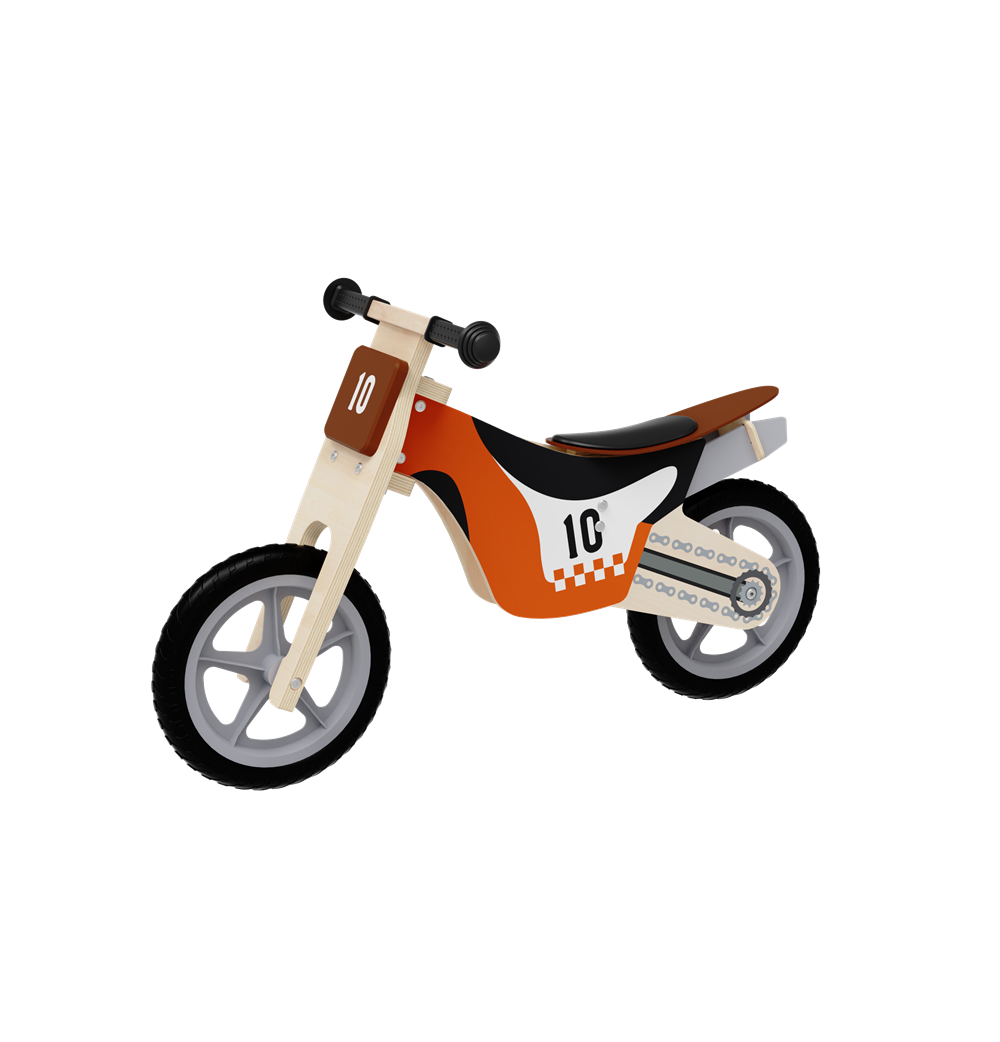 Adopts a full motocross motorcycle silhouette with a striking orange, black, and natural wood color scheme, paired with the iconic No.10 racing number, checkered flag decals, and simulated engine details. The design ignites children’s racing imagination and role-play fun.