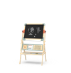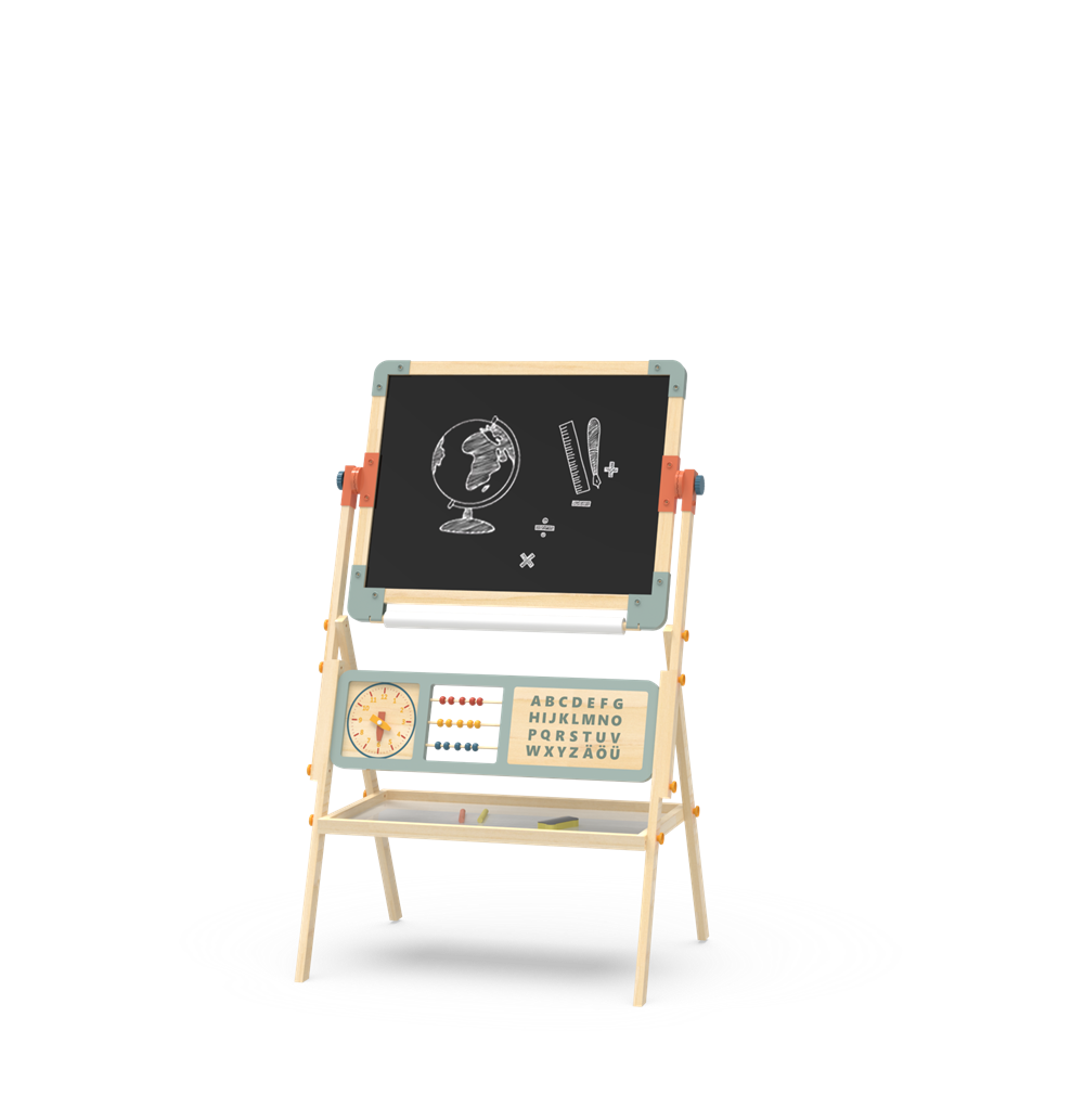 Adjustable & Durable: The easel’s height is easily adjustable to accommodate growing children, while the solid wood frame and sturdy legs ensure long-lasting, stable play. A convenient bottom tray keeps art supplies (chalk, markers, eraser) neatly organized and within reach.