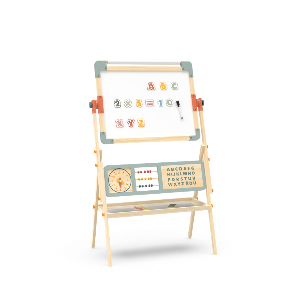Chalkboard Side: A smooth black chalkboard surface for traditional chalk drawing, perfect for practicing letters, numbers, and freehand art.