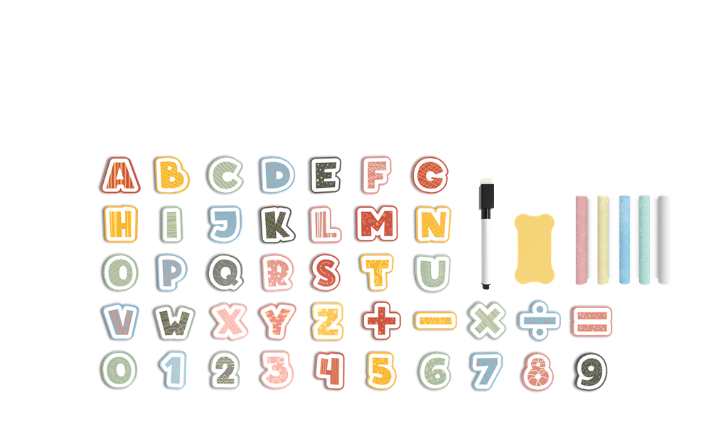 Whiteboard Side: A glossy whiteboard surface for marker writing, with magnetic letter and number tiles to practice spelling and math equations.