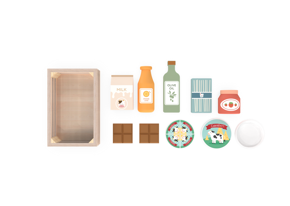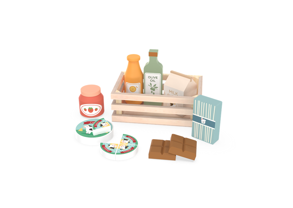 The set includes a sturdy wooden crate for easy storage and organization, plus a variety of play food essentials: a strawberry jam jar, olive oil bottle, orange juice bottle, paper milk carton, sliced cheese rounds, chocolate bars, and a pasta box. Each piece is detailed with playful, kid-friendly illustrations to mimic real pantry staples, making it easy for children to engage in creative “cooking,” “shopping,” and “meal prep” scenarios.