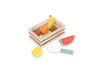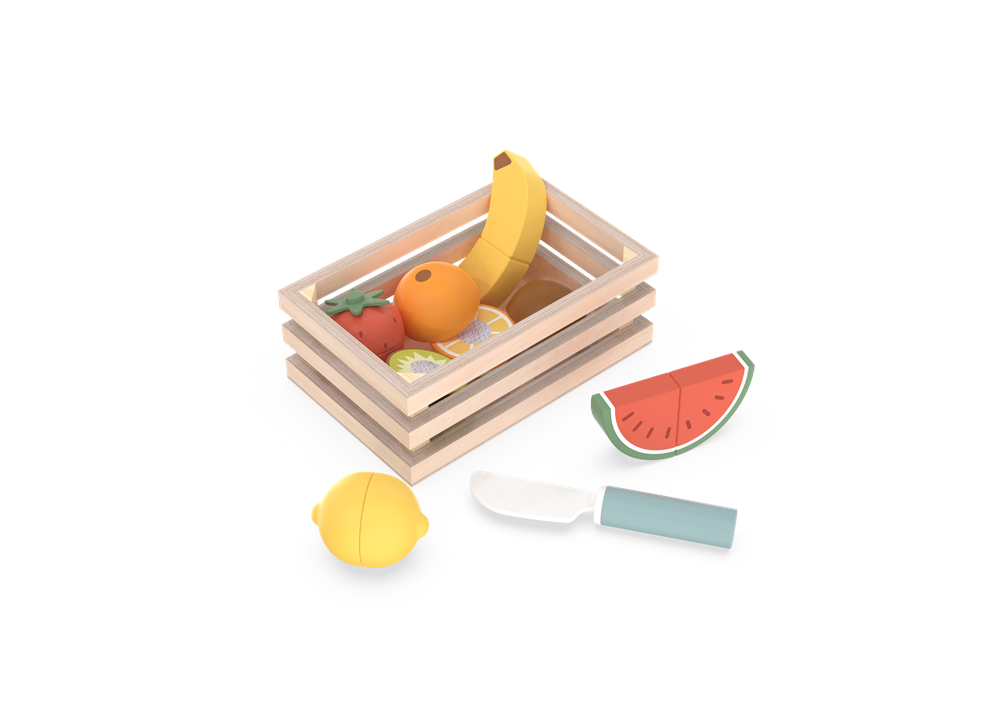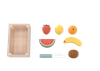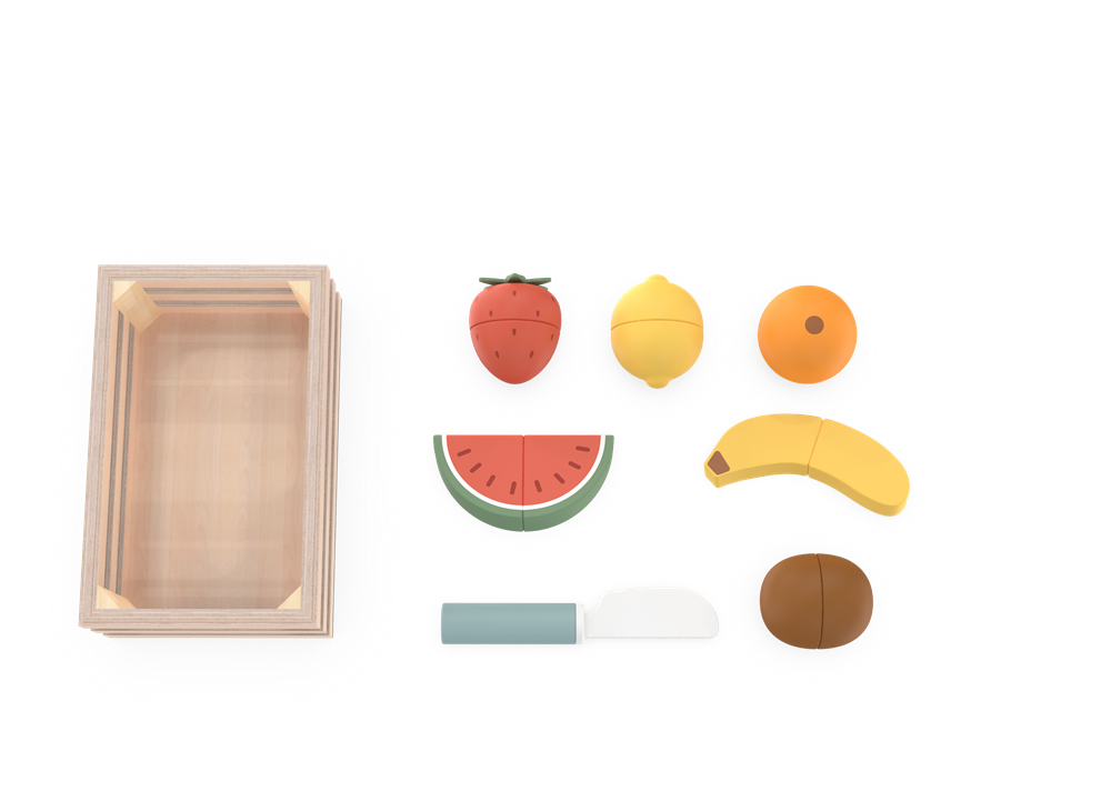The set includes a sturdy wooden crate for easy storage, plus a colorful assortment of velcro-attached “cuttable” fruits: a curved banana, plump orange, juicy strawberry, zesty lemon, sweet kiwi, tangy orange slice, and a refreshing watermelon wedge. Each piece splits apart with a satisfying “snap” when used with the included child-safe wooden knife, letting kids practice chopping and sorting just like a real chef.