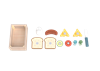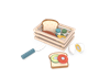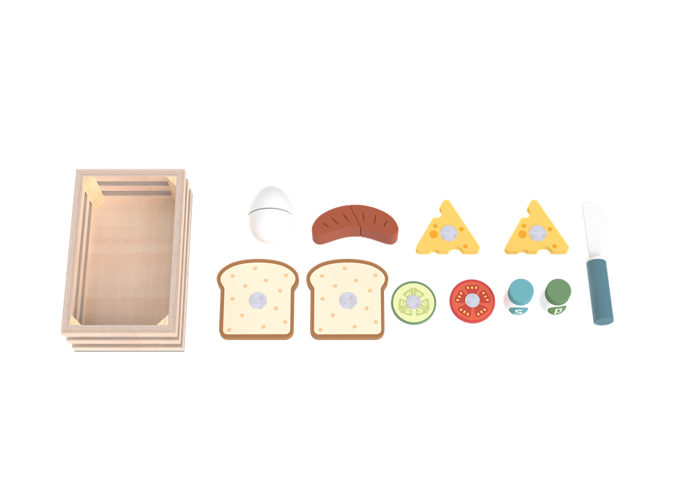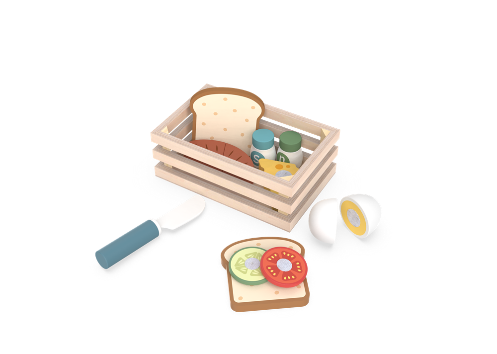 The set includes a sturdy wooden crate for tidy storage, plus a charming array of breakfast essentials: slices of bread, velcro-attached cucumber and tomato toppings, a slice of cheese, a split hard-boiled egg, salt and pepper shakers, and a child-safe wooden knife for spreading and “cutting.” Kids can layer toppings to build their own custom sandwich, or arrange the pieces to create a complete breakfast plate—just like a real chef!
