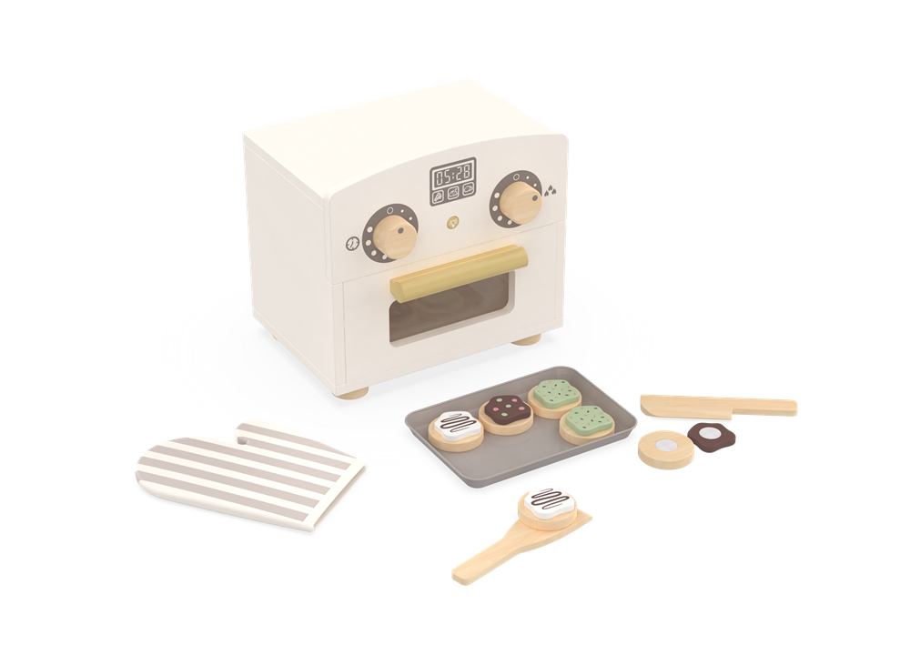 This cozy wooden oven & baking playset brings the sweet joy of homemade baking to pretend play, perfect for little pastry chefs aged 2 and up. Crafted from smooth, child-safe wood with non-toxic creamy white finishes, it features warm, minimalist design and interactive components to create an immersive culinary adventure.