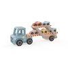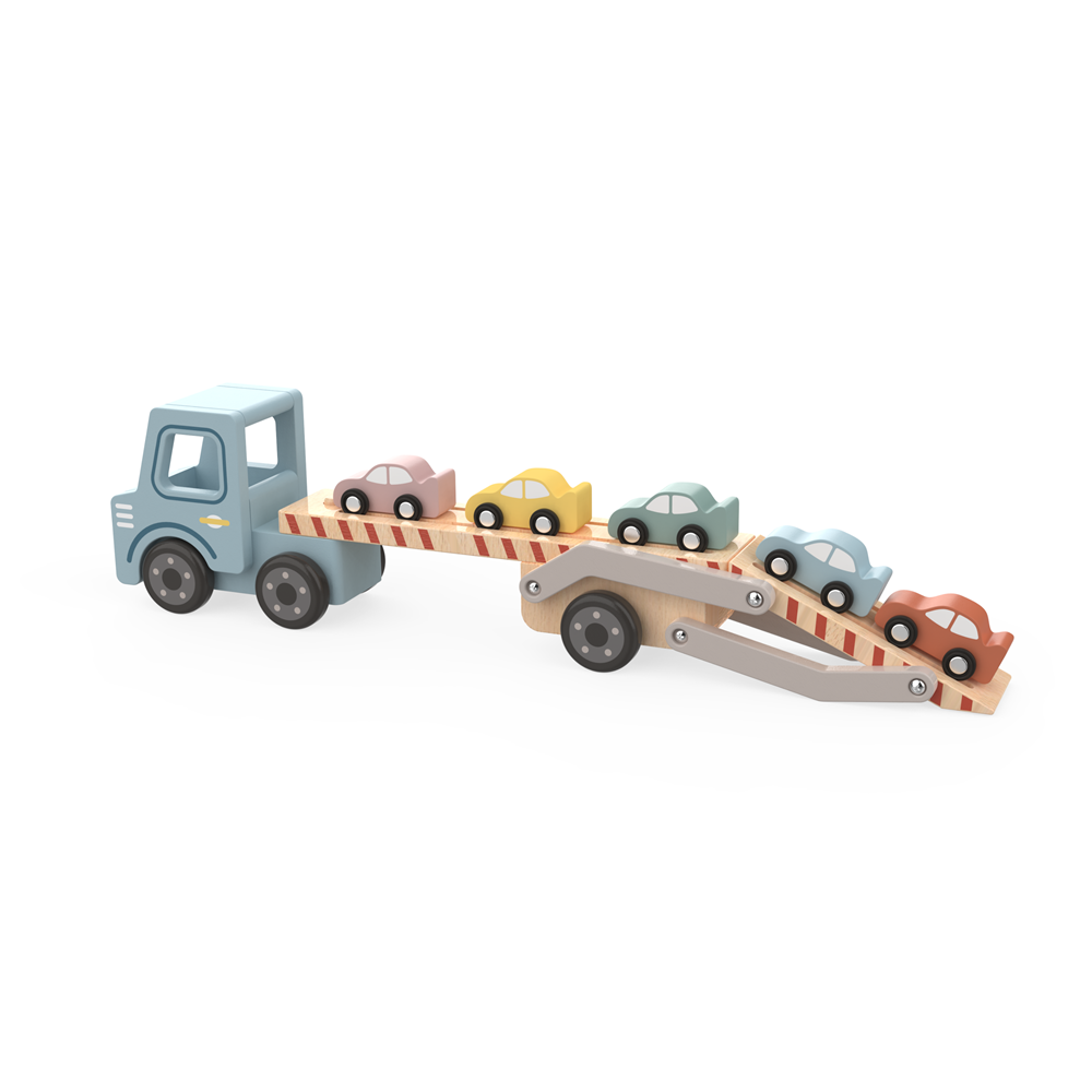 Premium Wooden Double-Decker Car Transporter Set with 5 mini cars, crafted from safe natural wood with non-toxic pastel finishes. Features a foldable double-deck frame and smooth-rolling wheels, designed to boost fine motor skills and spark imaginative transportation play. Complies with EN 71/ASTM safety standards—ideal for toddlers 18M+.