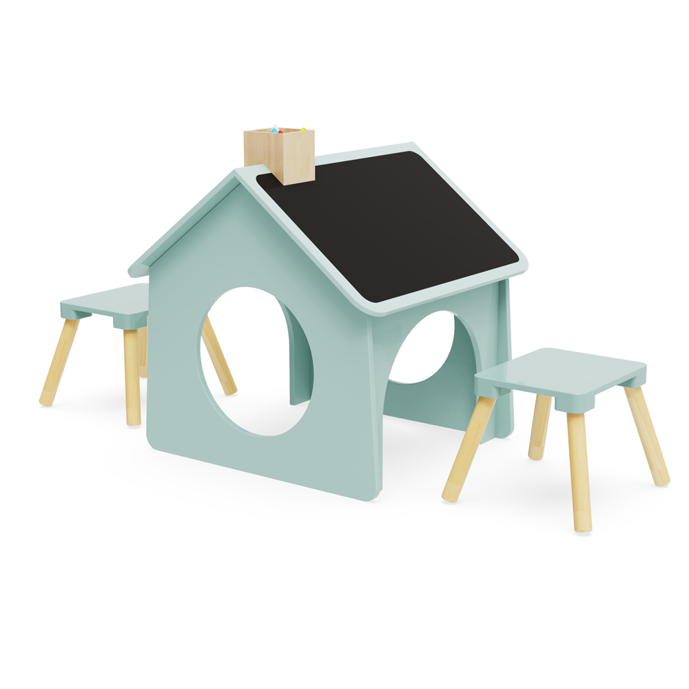 This 3-in-1 wooden playhouse set features a house-shaped play structure with a blackboard roof, built-in storage, and two matching stools. Made from safe, non-toxic wood in a mint green finish, it combines imaginative play, art activities, and seating in one compact design. Ideal for kids aged 3+, compliant with EN 71/ASTM standards.