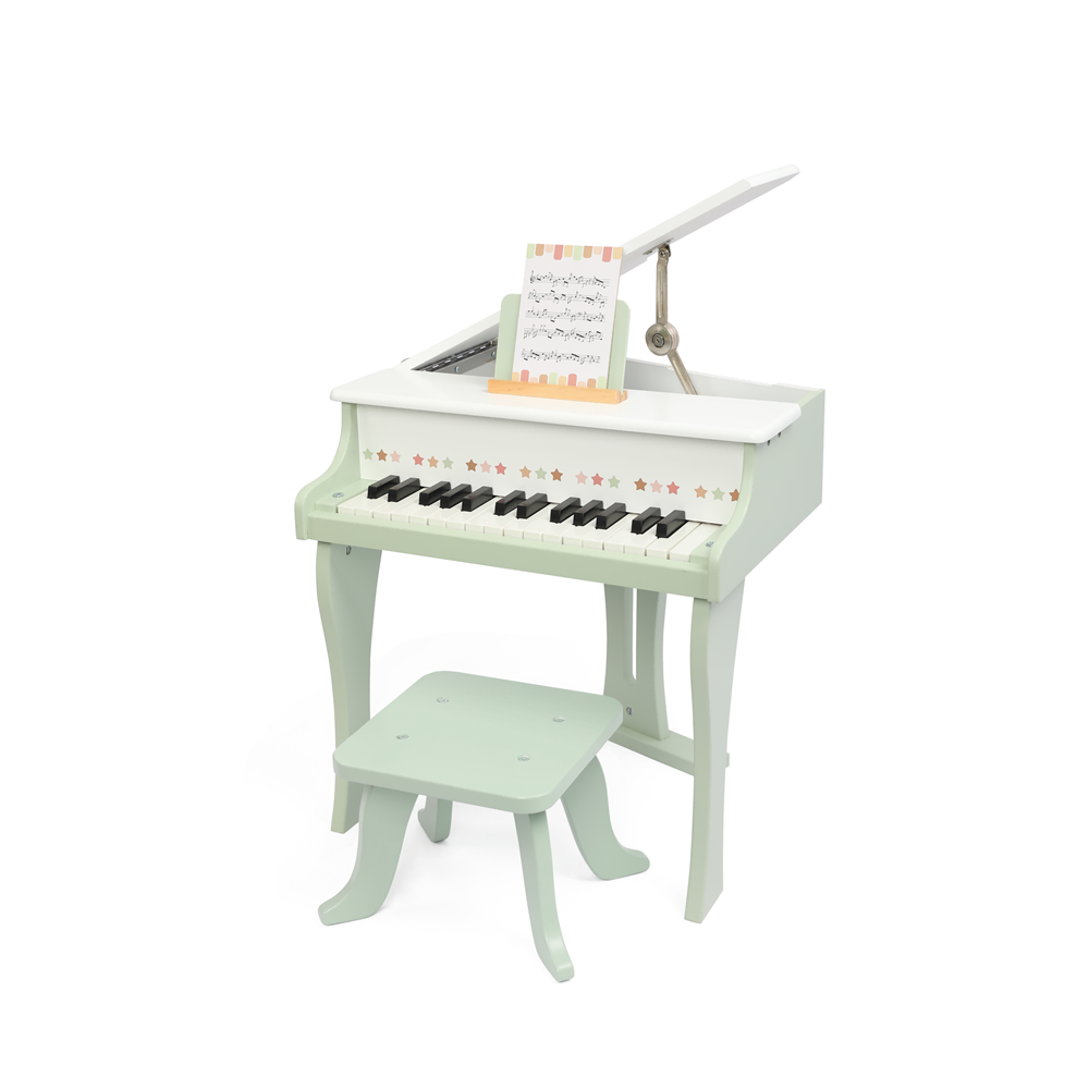 This elegant wooden grand toy piano is the perfect first instrument to spark your little one’s love of music! Designed with a charming mint-green and white finish, it features 30 smooth, responsive keys that produce clear, melodic tones—ideal for tiny hands to explore notes, scales, and simple melodies.