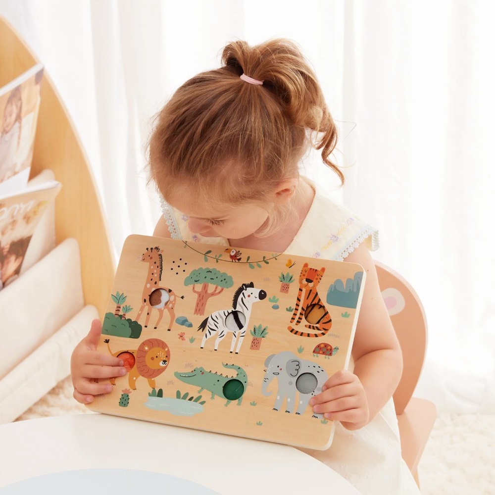 Sensory Safari Play: 8-piece wooden puzzle combining touch and sound.