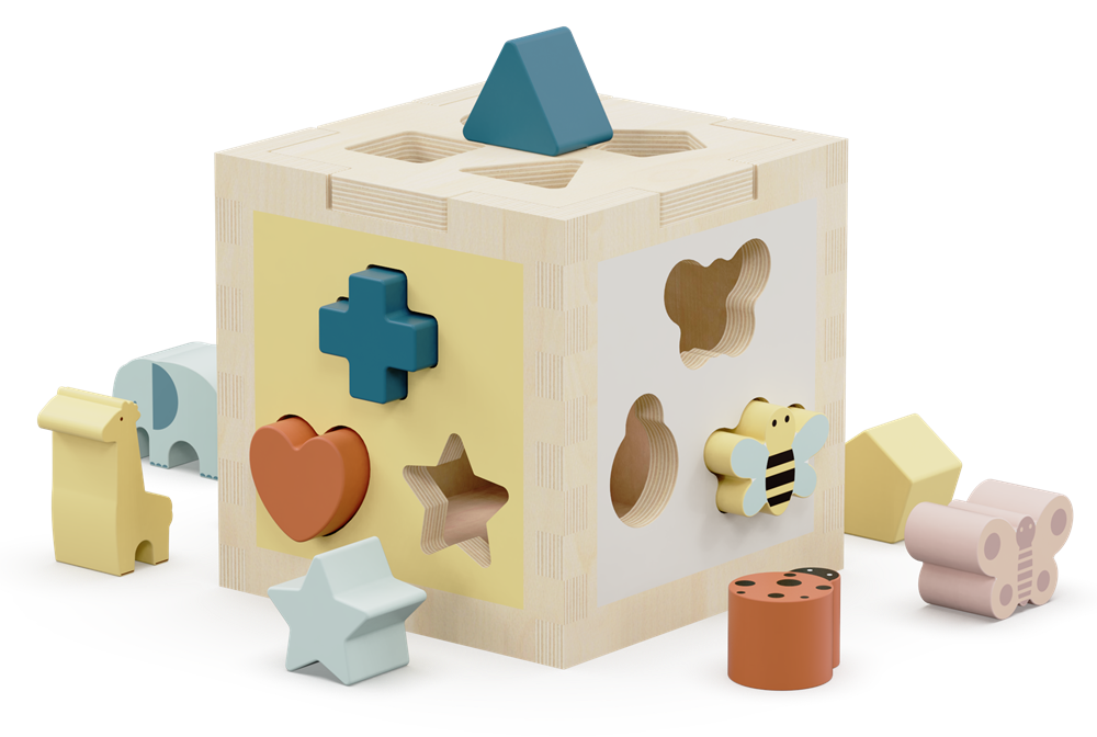 Unique Shape Blocks: Includes a variety of shapes such as triangles, stars, hearts, crosses, animals, and more, each perfectly sized to fit into the corresponding precision-cut holes on the cube.